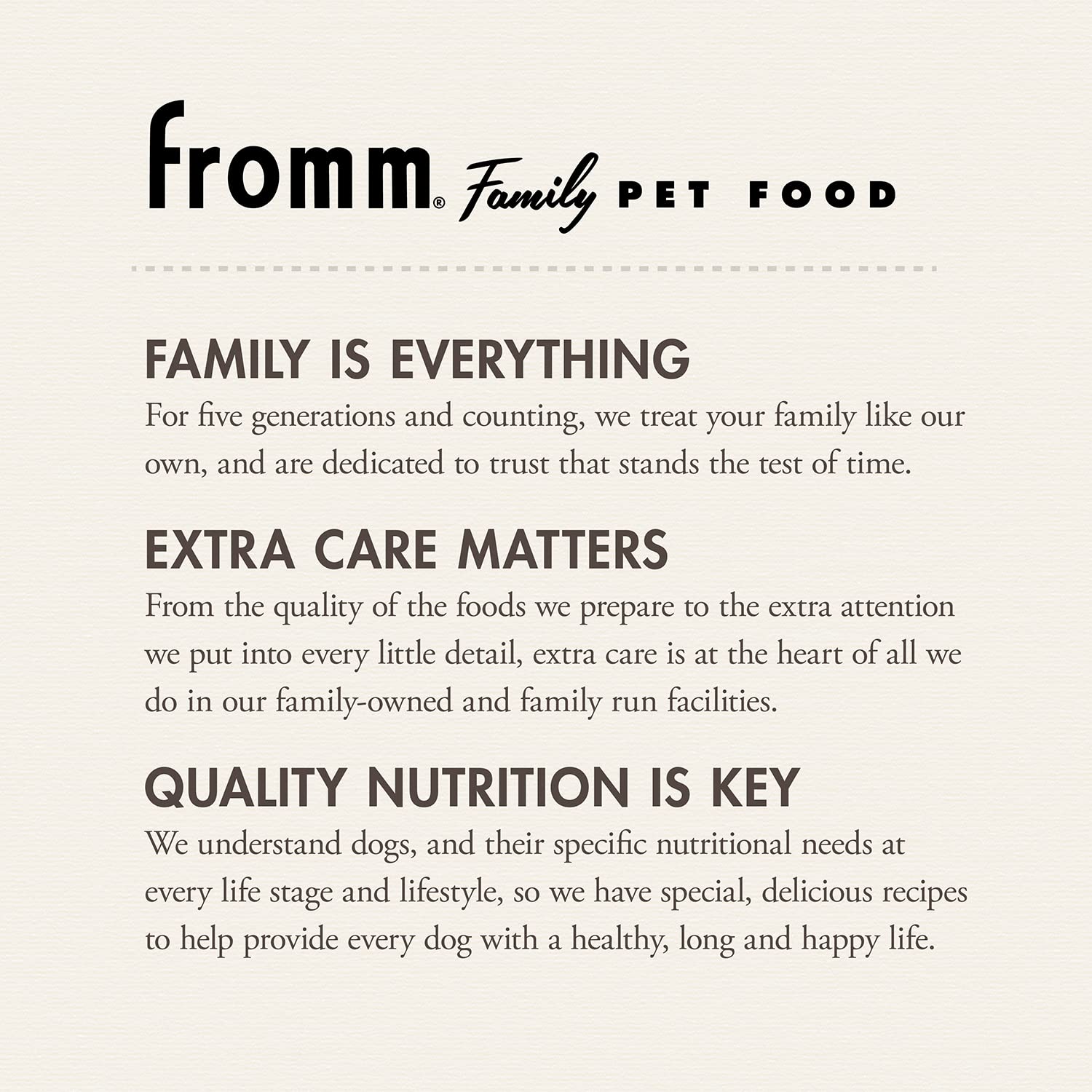 - FAMILY OWNED & OPERATED - Fromm Family Foods is a fifth-generation family-owned-and-operated pet food company based in Wisconsin. Since 1904, our family has maintained a tradition of quiet innovation dedicated to the health and nutrition of animals.