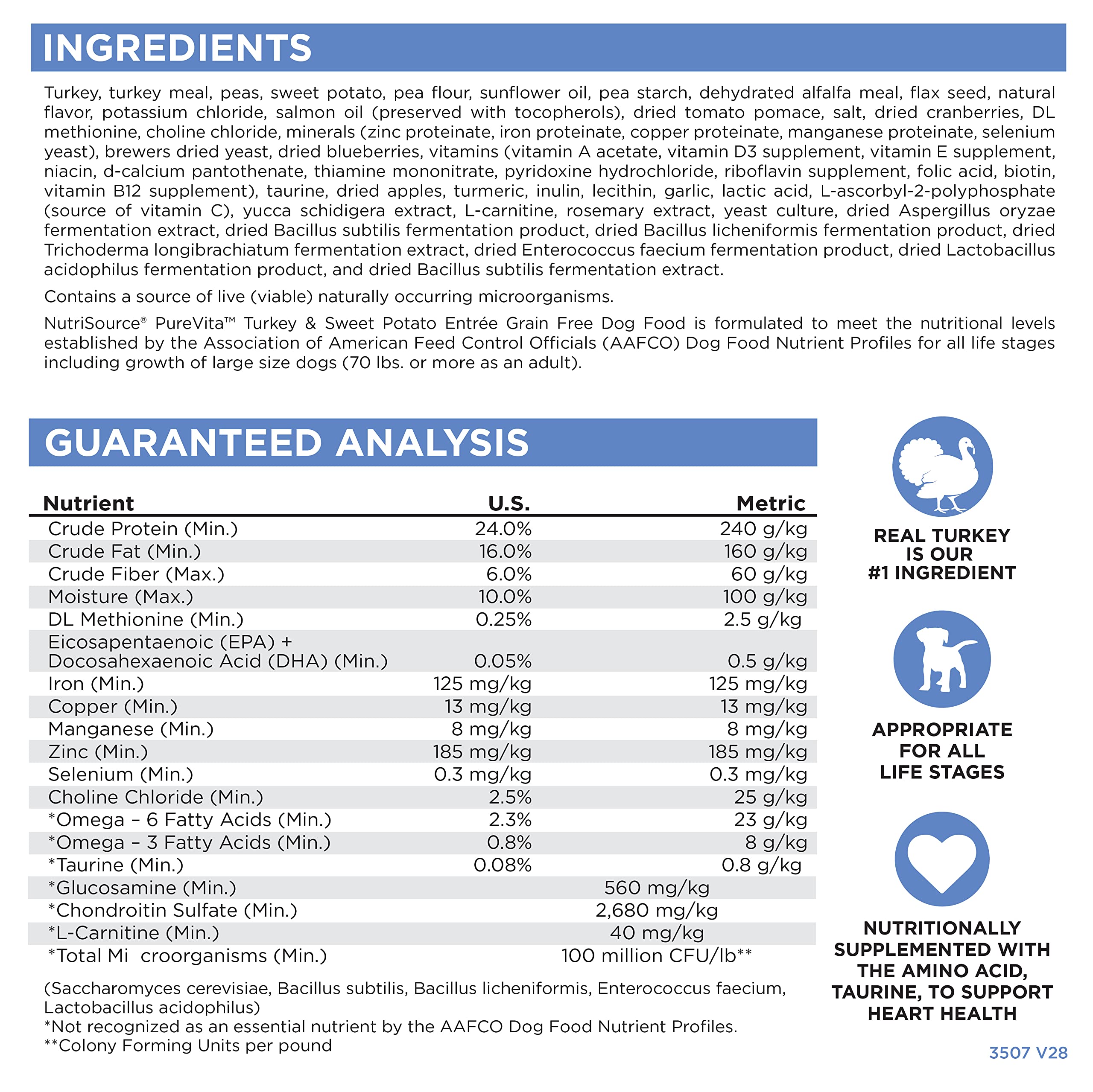 - As a member of our grain free series, NutriSource Pure Vita Turkey and Sweet Potato Dry Dog Food is formulated to meet AAFCO guidelines for all lifestages